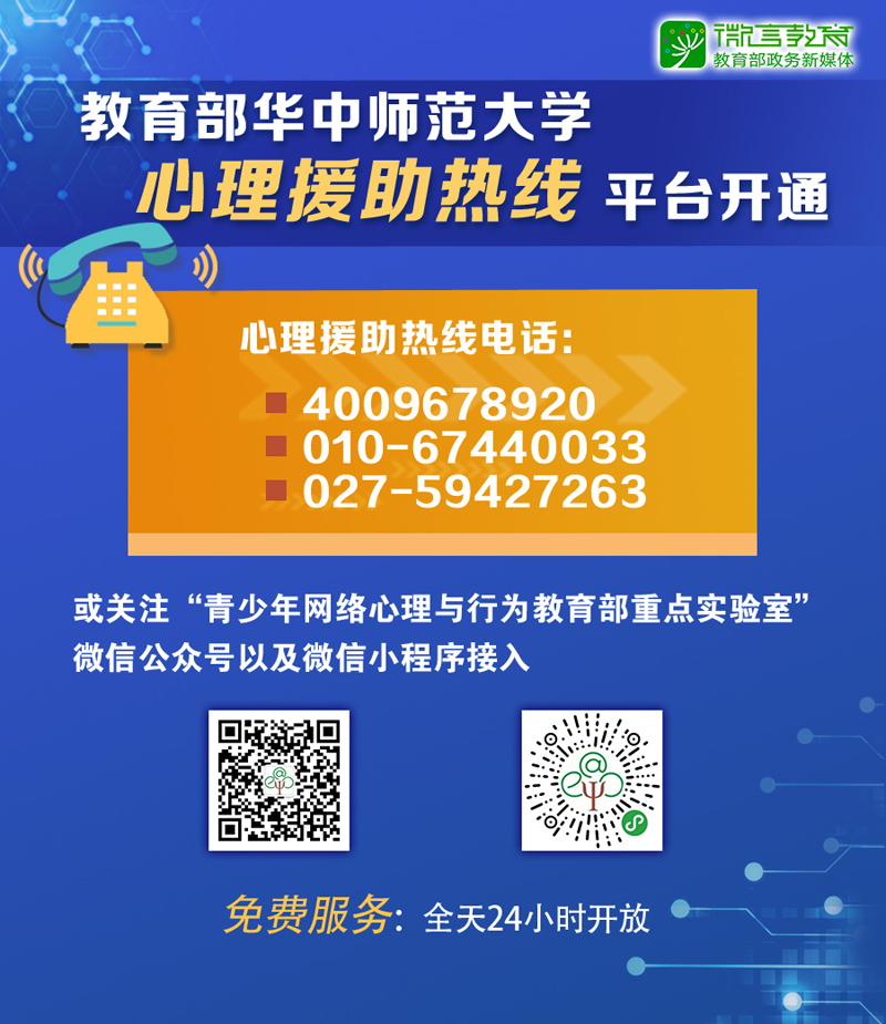 扫描上方二维码,关注“青少年网络心理与行为教育部重点实验室”微信公众号,点击菜单栏中的“心理热线”即可接入