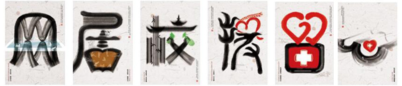 福建省闽江学院的《科学防疫网络学习》系列作品以水墨书画为整体效果,以书本的侧影组合成了“网、居、校、留、心”等书法文字,在其中穿插了反映互联网授课、居家学习、校园防疫、关爱留学生、心理疏导的视觉元素,以中华经典艺术的人文风韵展现出当代学子面对疫情时冷静、热心、团结、进取的气度。