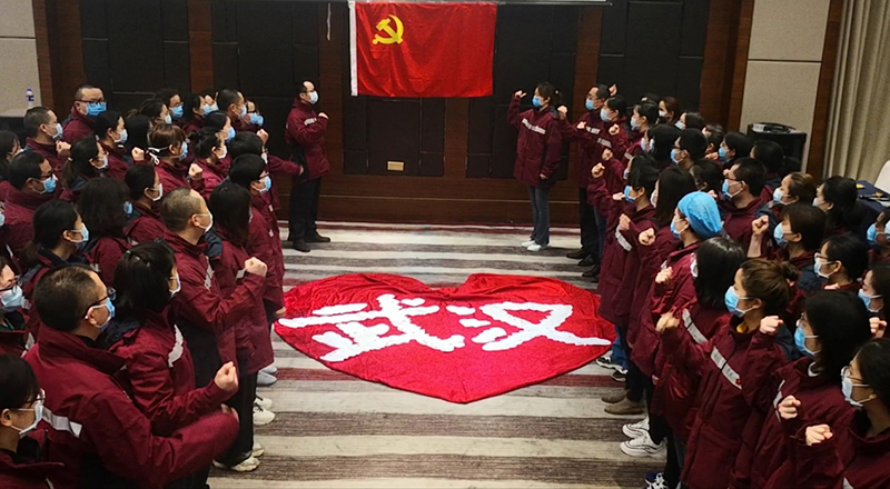 摄影作品《宣誓》,呈现了中南大学湘雅二医院援助武汉医疗队在驻地进行面对党旗宣誓活动,用“心”表达铮铮誓言。