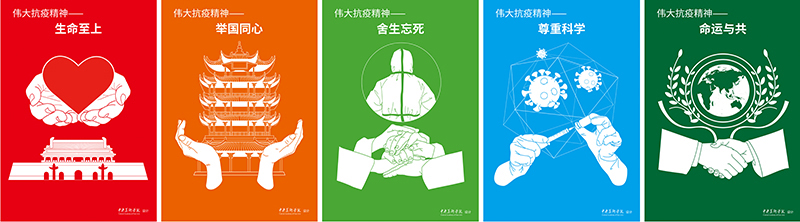 海报作品中,中央美术学院的《抗疫系列海报》以清晰明了的图形语言再现了习近平总书记对伟大抗疫精神的深刻阐述:“生命至上、举国同心、舍生忘死、尊重科学、命运与共”。