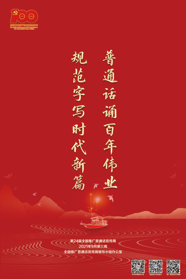 海报一,以“普通话诵百年伟业 规范字写时代新篇”为设计思路,背景为中共一大会址浙江嘉兴南湖,体现在党的坚强领导下语言文字事业百年光辉历程。